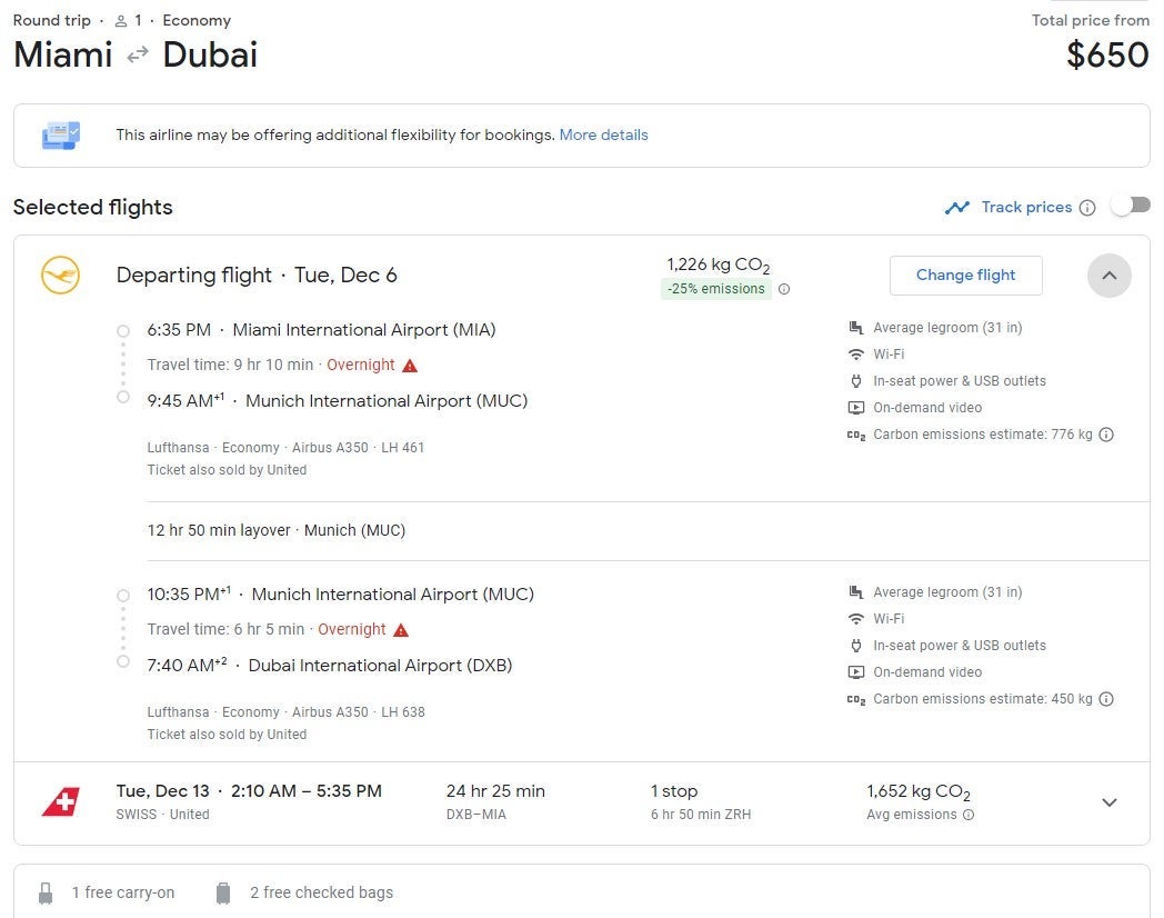 You can book a flight either on Lufthansa or United from Miami (MIA) to Dubai (DXB) for $650 round trip. The deal below includes a 12-hour layover in Munich on the departure flight and a stop in Zurich (ZRH) of nearly seven hours on the return flight so you should be prepared for that if booking this particular flight.