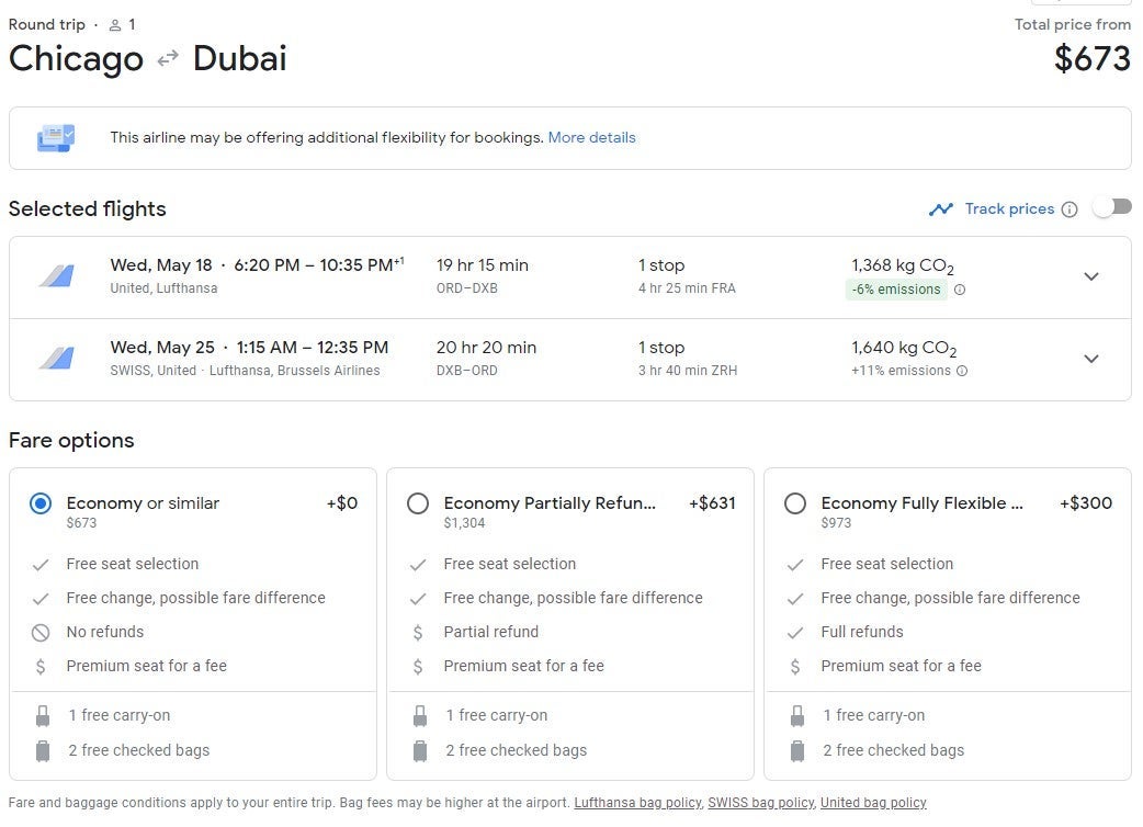 Flights from Chicago (ORD) to Dubai (DXB) are available for $673 round-trip. The departure flight includes a stop in France and there is a layover in Zurich (ZRH) on the way back. According to Google Flights, the price for this deal is over $600 cheaper than usual for the dates below in May.