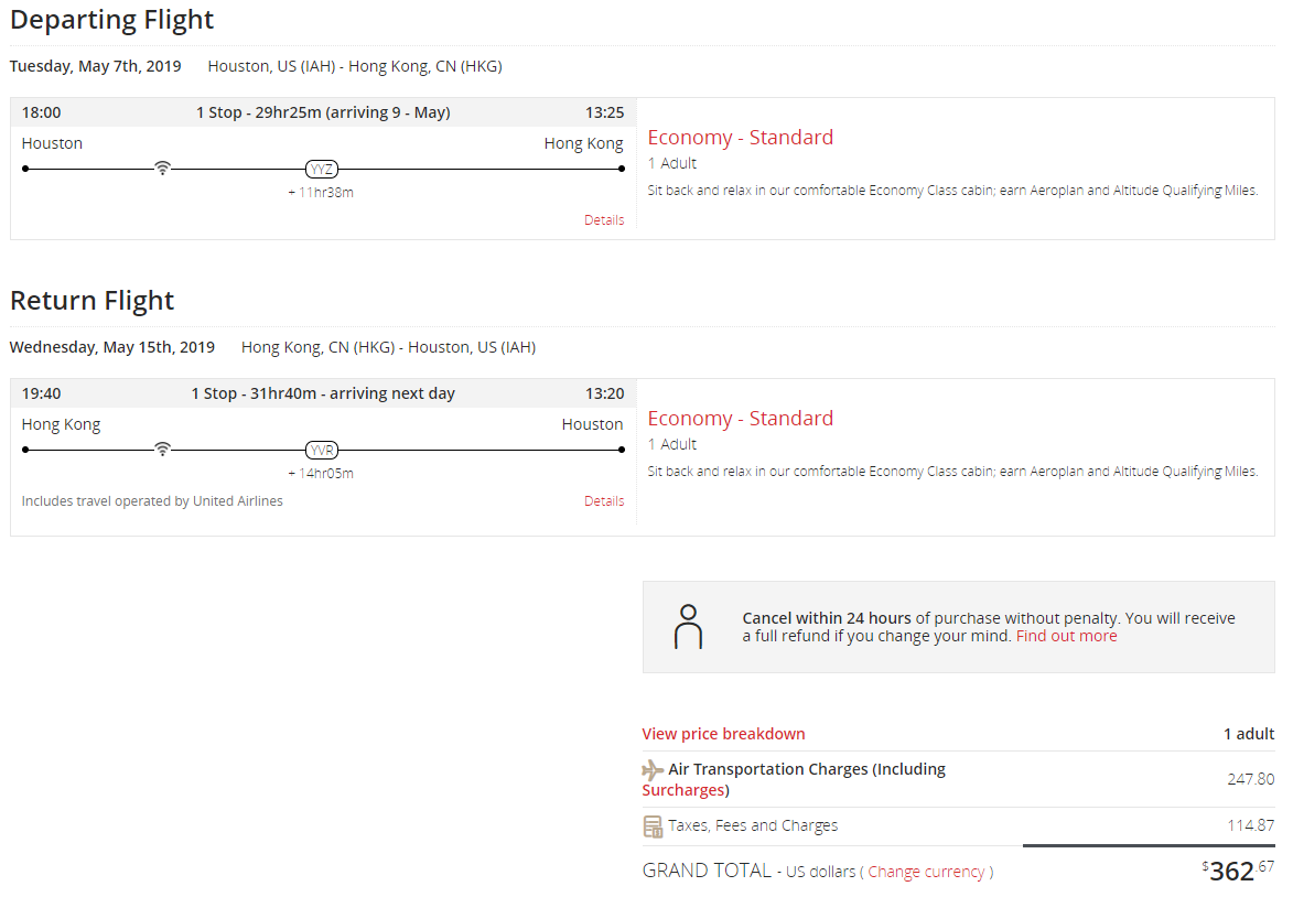 Houston Intercontinental (IAH) to Hong Kong (HKG) for $363 round-trip on Air Canada: