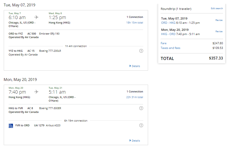 Chicago O'Hare (ORD) to Hong Kong (HKG) for $357 round-trip on Air Canada/United: