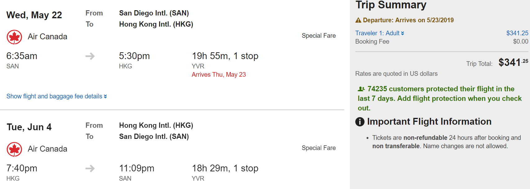 San Diego (SAN) to Hong Kong (HKG) for $341 round-trip on Air Canada via Orbitz: