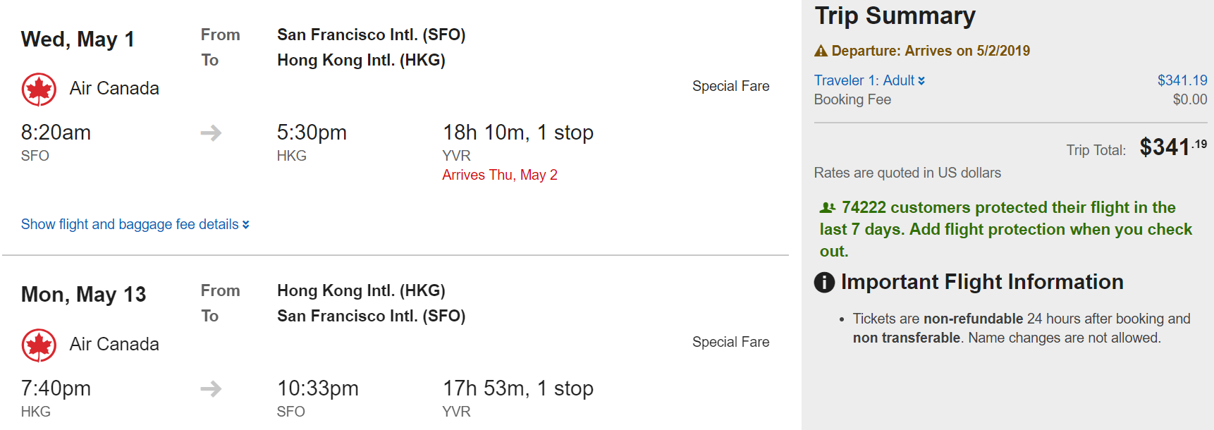 San Francisco (SFO) to Hong Kong (HKG) for $341 round-trip on Air Canada via Orbitz: