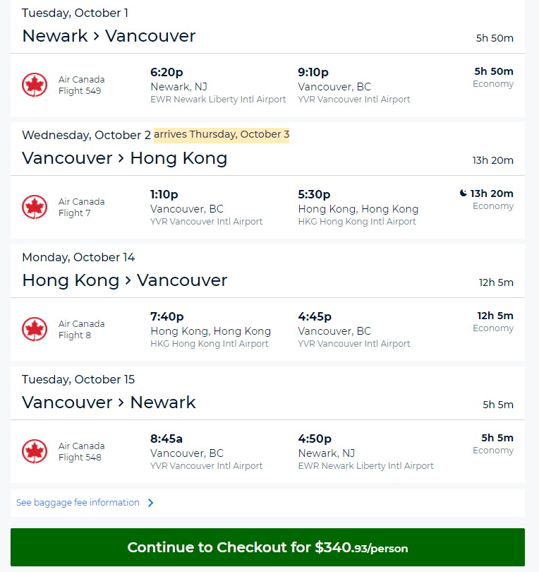 San Francisco (SFO) to Hong Kong (HKG) for $341 round-trip on Air Canada via Orbitz: