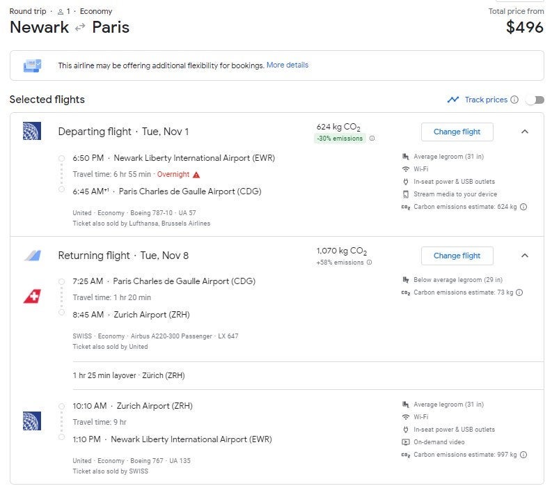 Maybe you're thinking of French wine and pastries? There is a deal from Newark (EWR) to Paris (CDG) at $496 round-trip at the beginning of November. The departure is a direct, overnight flight on United, but the return trip includes a segment form Paris (CDG) to Zurich (ZRH) on Swiss International Air Lines before taking a United flight home from there to New Jersey.