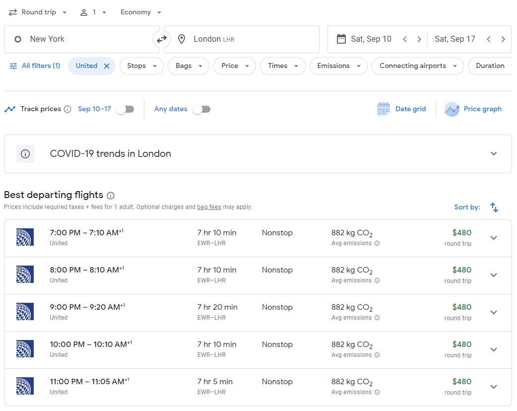 There is a wide selection of direct flights throughout September and October from Newark (EWR) to London (LHR) at $480 round-trip. Below are some nonstops we found for a trip from Sept. 10-17.
