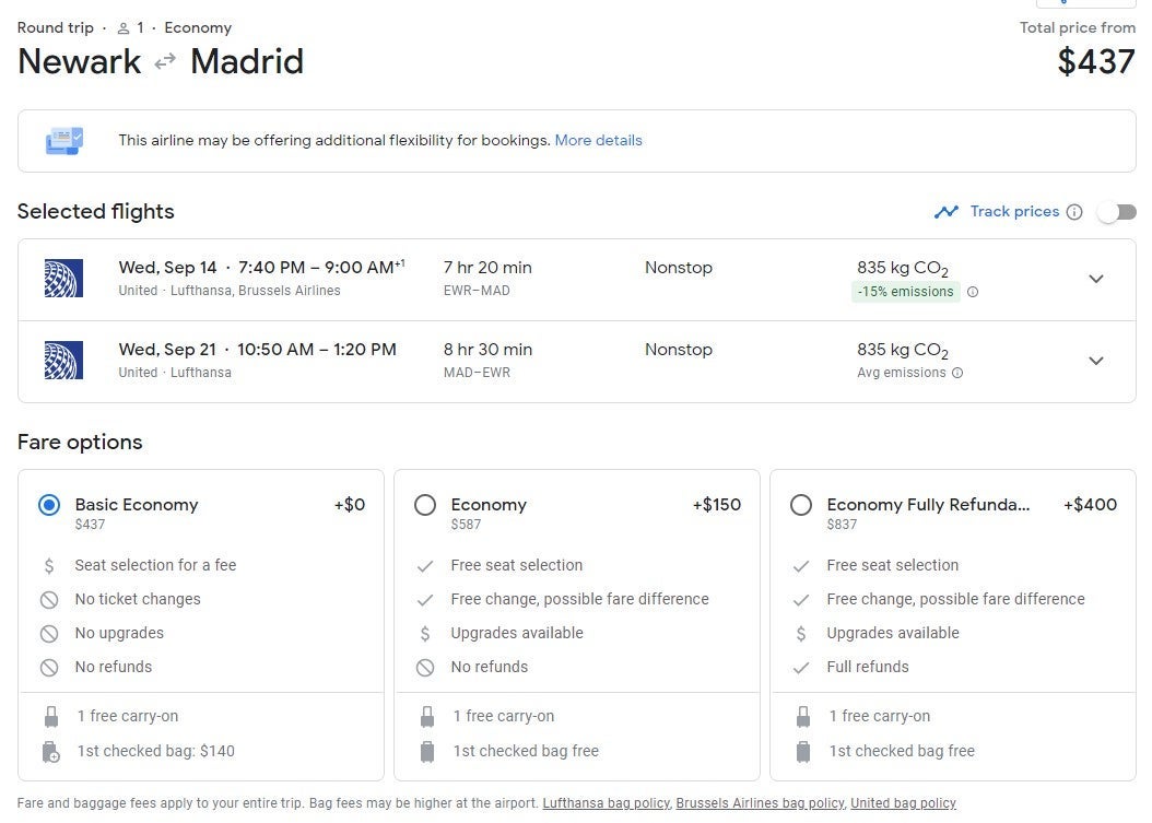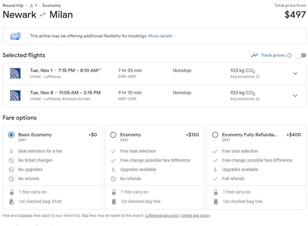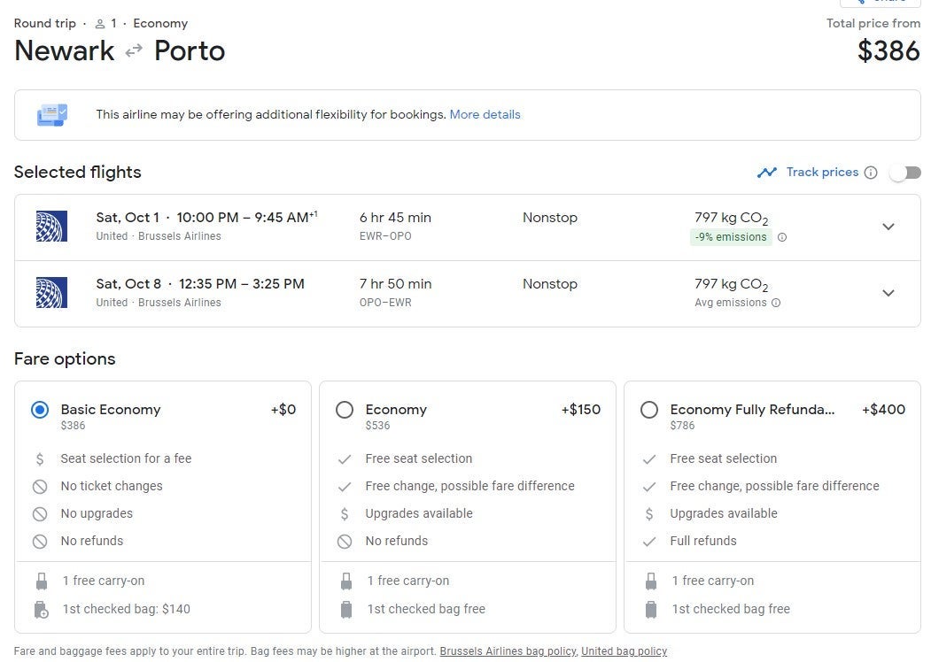 These fares are for basic economy seating on United, which includes a carry-on. A checked bag and seat selection will each cost an additional fee.