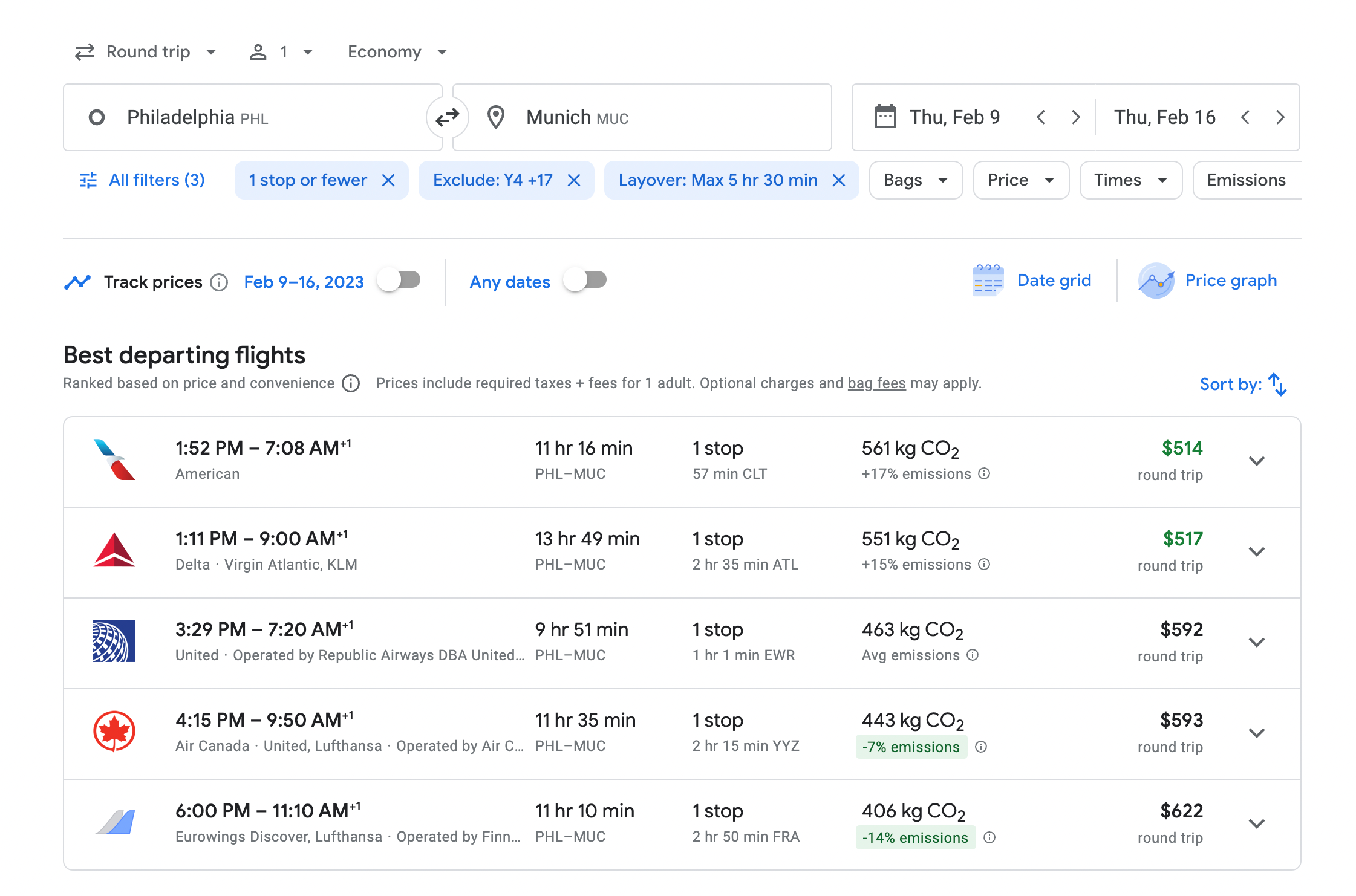 For a Feb. 9 flight to Munich from Philadelphia, Google Flights shows the American $514 flight as the cheapest option. Delta also offers a flight from Philadelphia priced at $517. The American flight to Munich departs Philadelphia at 1:52 p.m. and includes a layover in Charlotte.