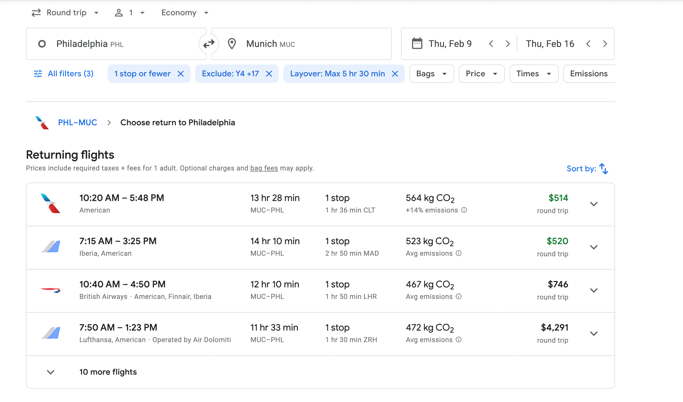 When returning to Philadelphia, American offers a Feb. 16 flight that departs Munich at 10:20 a.m. The returning flight also has a layover in Charlotte.