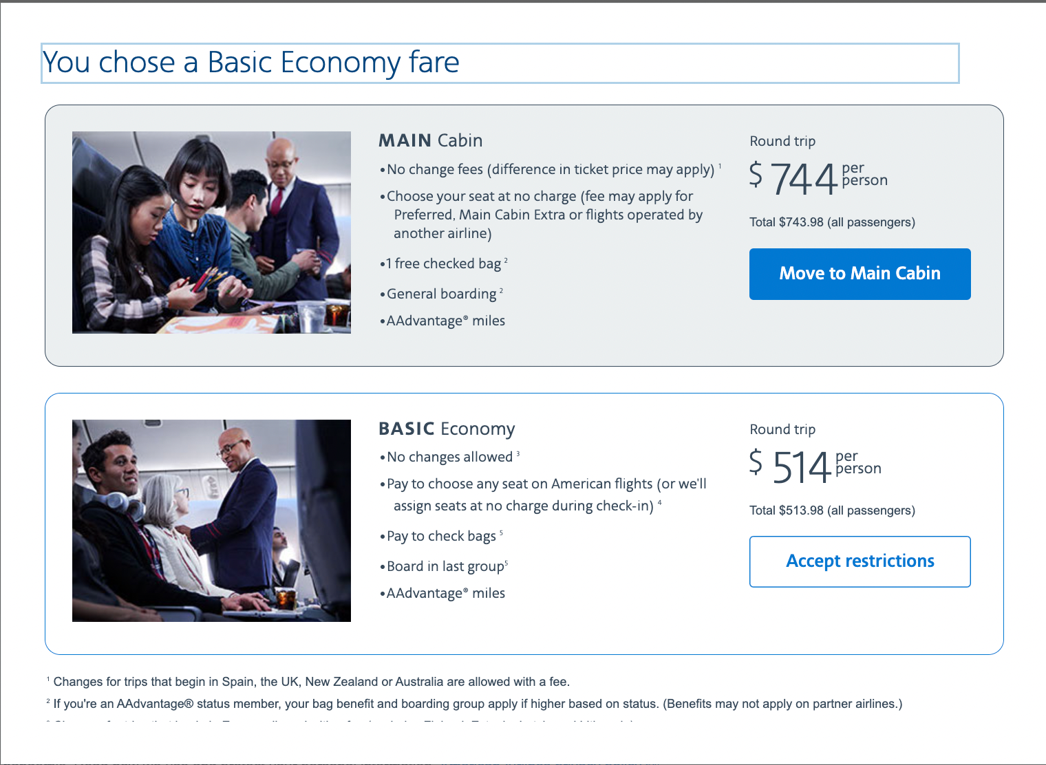 The fares featured in this deal are for basic economy only. American's basic economy does not allow passengers to make changes to their tickets. Additionally, passengers must pay extra to check a bag and to select a seat.