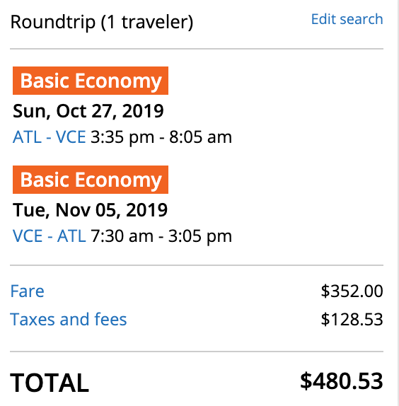 Atlanta (ATL) to Venice (VCE) for $481 round-trip on United:
