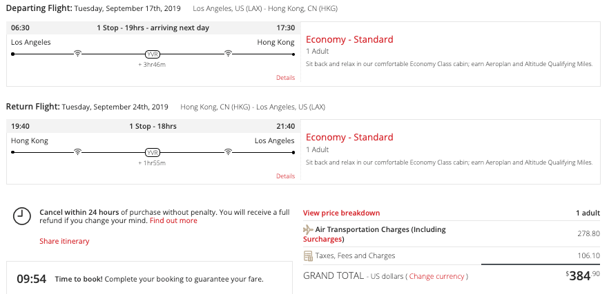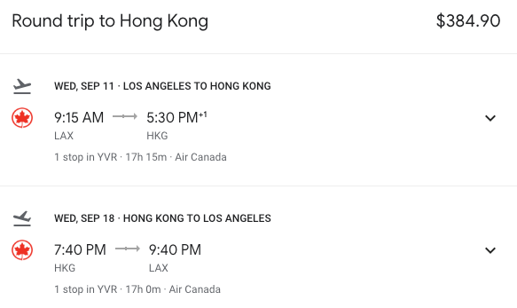 Los Angeles (LAX) to Hong Kong (HKG) for $385 round-trip on Air Canada: