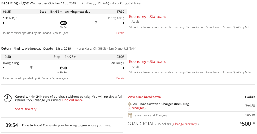 San Diego (SAN) to Hong Kong (HKG) for $501 round-trip on Air Canada: