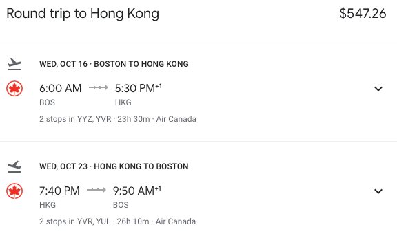 Boston (BOS) to Hong Kong (HKG) for $547 round-trip on Air Canada: