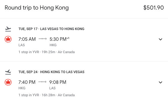 Las Vegas (LAS) to Hong Kong (HKG) for $502 round-trip on Air Canada: