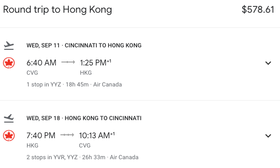 Cincinnati (CVG) to Hong Kong (HKG) for $579 round-trip on Air Canada: