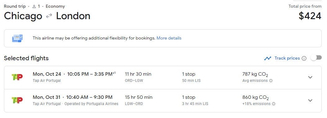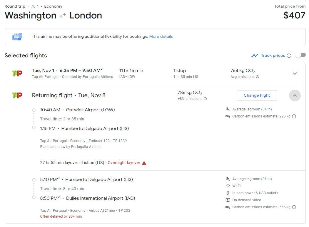 Flights from Washington, D.C. (IAD) to London (LGW) are $407 round trip. There is also a layover of nearly 28 hours on the return flight in Lisbon (LIS). According to Google Flights, this flight is $300 cheaper than usual for the dates below.