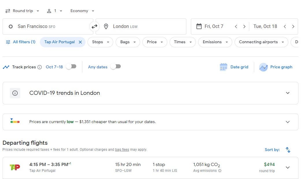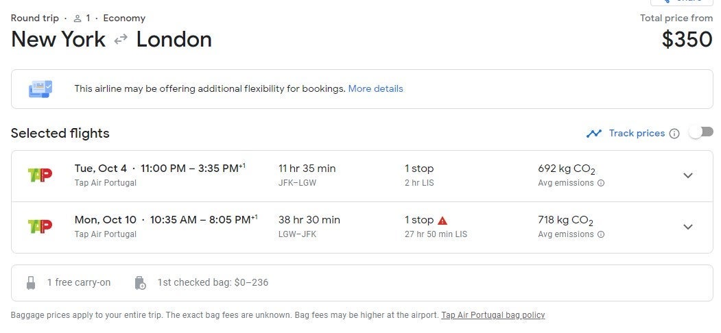 One of the most affordable fares is from New York (JFK) to London (LGW) for $350 round trip. The return flight allows for a full day in Lisbon (LIS) with almost a 28-hour layover.