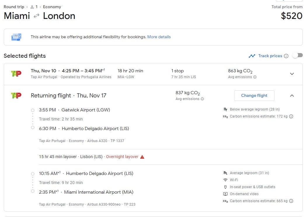 Flights from Miami (MIA) to London (LGW) are $520 round-trip. This price is over $250 cheaper than usual for the dates in November below.