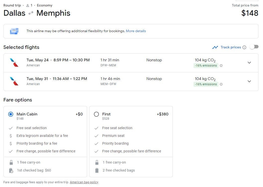 In the deal below, flights from Dallas (DFW) to Memphis (MEM) cost $148 round-trip. The nonstop flights are short ones under two hours each way.