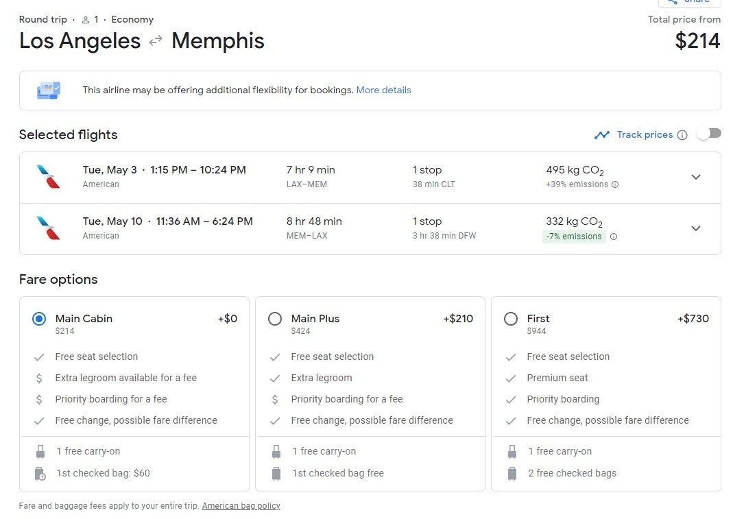 Fly from Los Angeles (LAX) to Memphis (MEM) for $214 round-trip. The offer below includes a short stop in Charlotte (CLT) on the departure flight and a longer stop in Dallas (DFW) on the return flight.