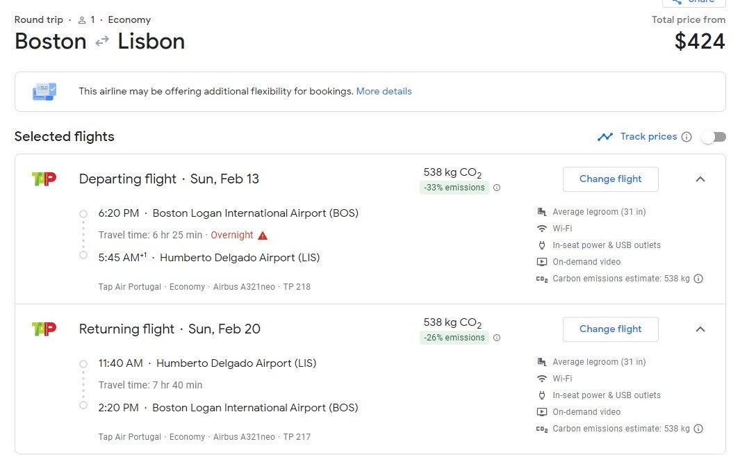 There are limited flight options from Boston (BOS) to Lisbon (LIS) at $424 round-trip. We found one in the middle of February.