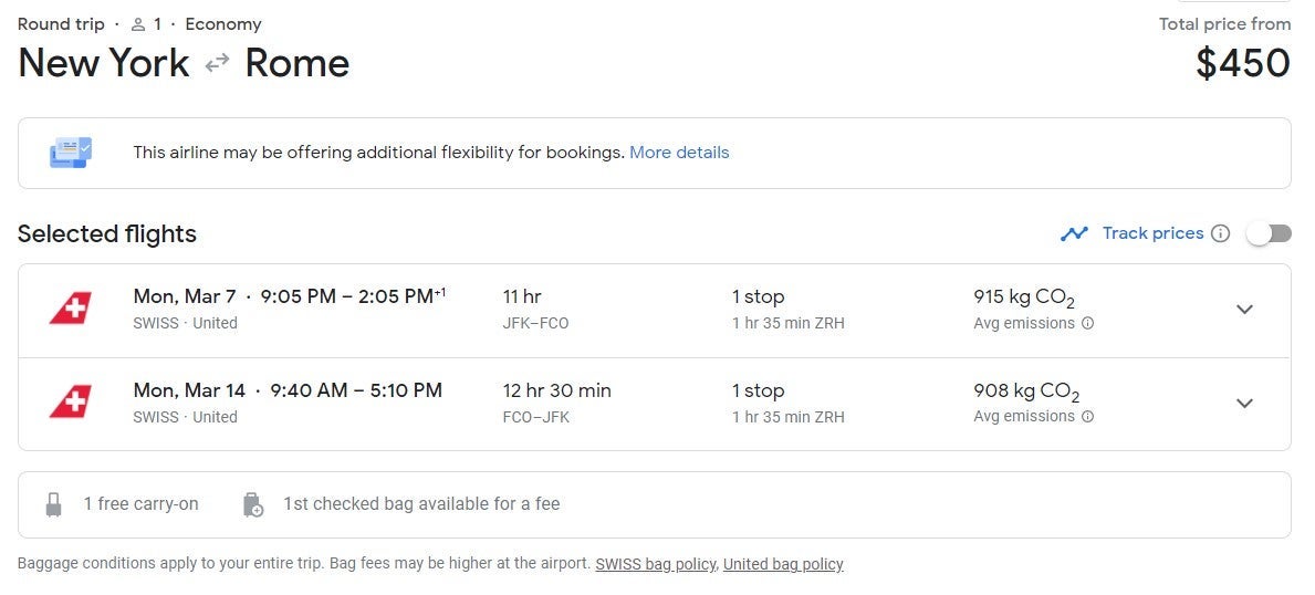 There is also a flight on Swiss Airlines from New York (JFK) to Rome (FCO) for $450 round-trip with a stop in Zurich (ZRH) each way.