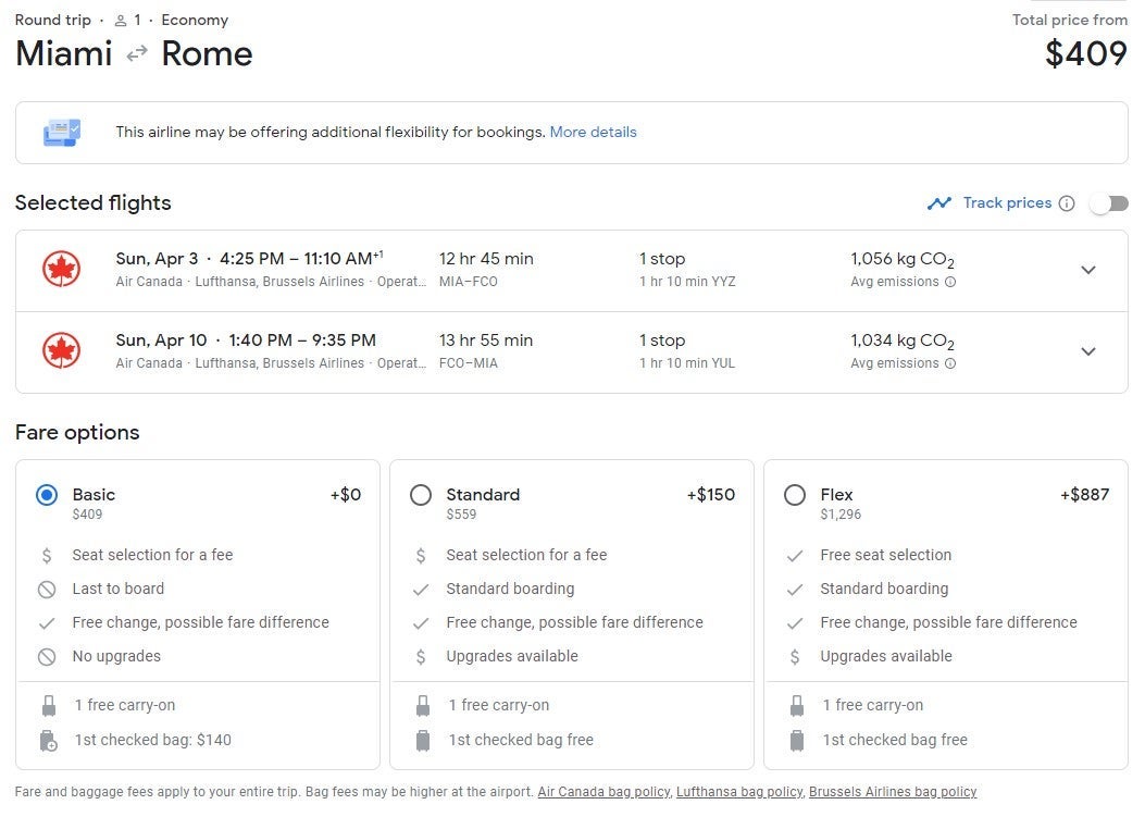 For a buck more, travelers can go to Rome (FCO) from Miami (MIA) on Air Canada at $409 round-trip. The departure has a short stop in Toronto (YYZ) and the return flight has one in Montreal (YUL).