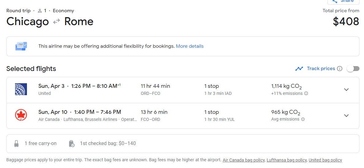 One of the most affordable offers we found was from Chicago (ORD) to Rome (FCO) for $408 round-trip. The departure is on United with a stop in Washington D.C. (IAD) and the return trip is via Air Canada with a stop in Montreal (YUL).