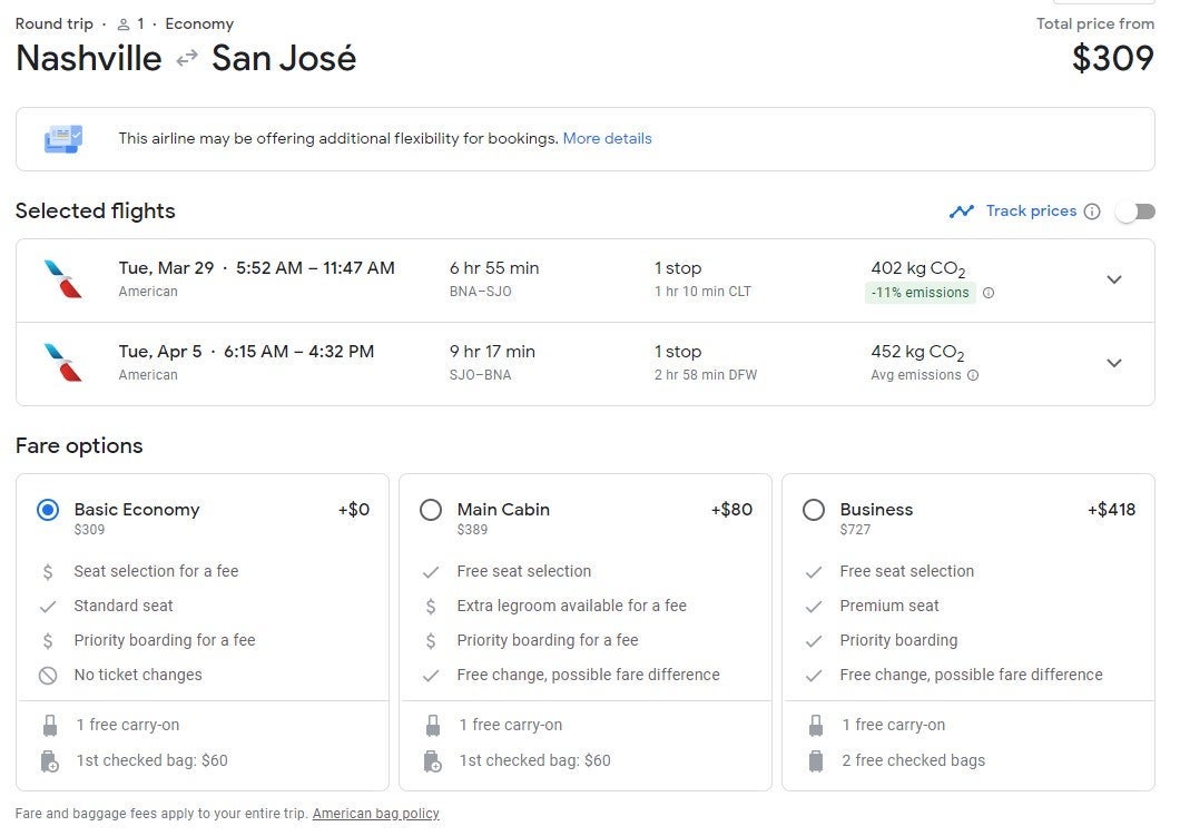 A flight to San Jose (SJO) from Nashville (BNA) from the end of March to the beginning of April costs $309 round-trip. There is a short stop in Charlotte (CLT) on the departure and a layover in Dallas (DFW) on the return flight.