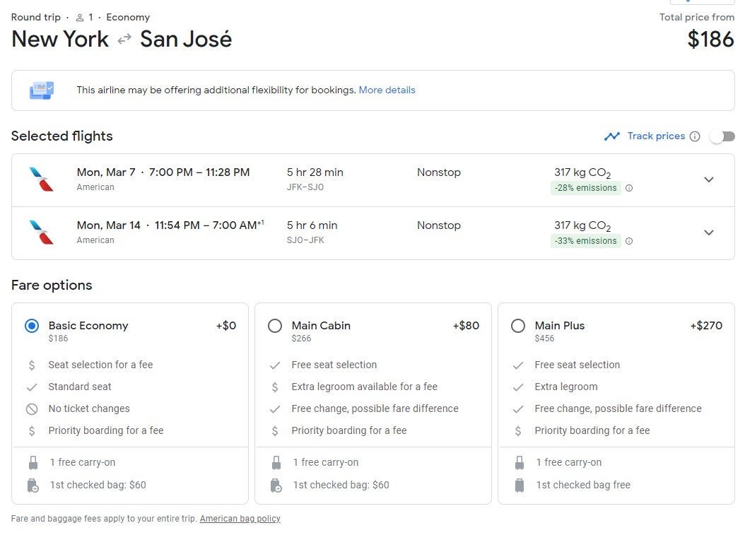 The deals below are for basic economy tickets on American, which include a standard seat and carry-on. A checked bag, seat selection and changes will cost extra. Most of the deals below are under $300 round-trip, but one of the most affordable fares we found to San Jose, Costa Rica (SJO), was from New York (JFK) at $186 round-trip. Flights at this price are limited in availability. The one featured here is for the beginning of March.