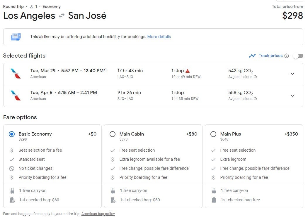 On the West Coast, travelers can fly from Los Angeles (LAX) to San Jose (SJO) for $298 round-trip with a stop in Dallas (DFW) each way.