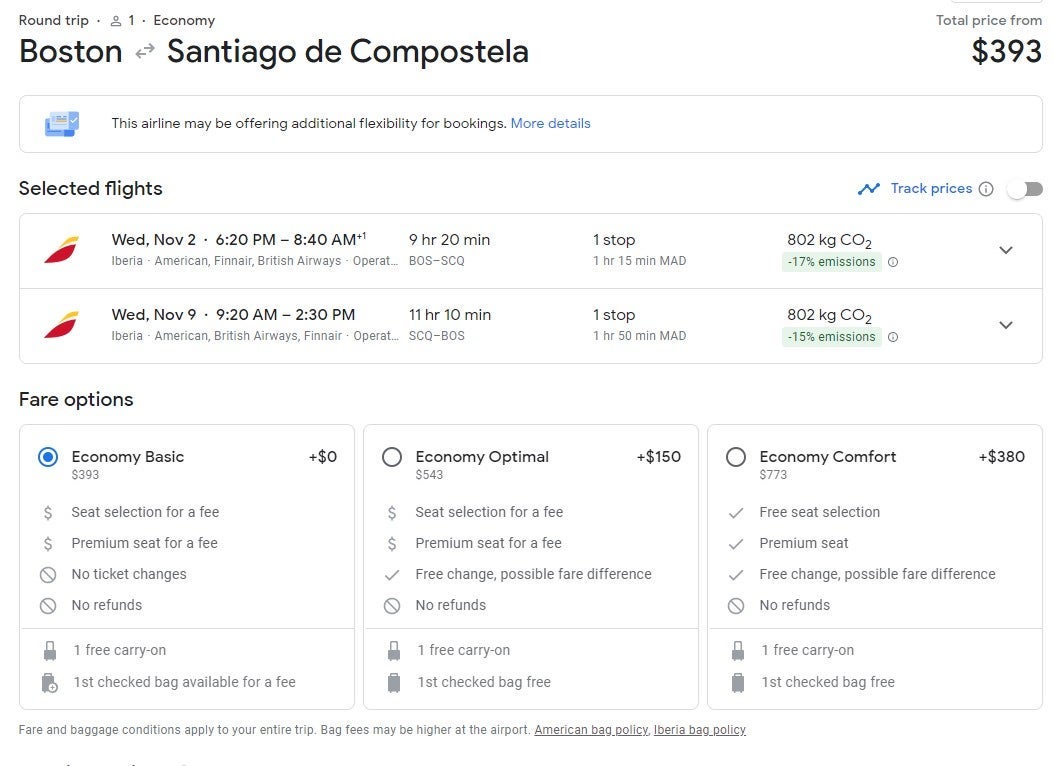 Travelers can fly to Santiago de Compostela from Boston (BOS) for $393 round-trip.