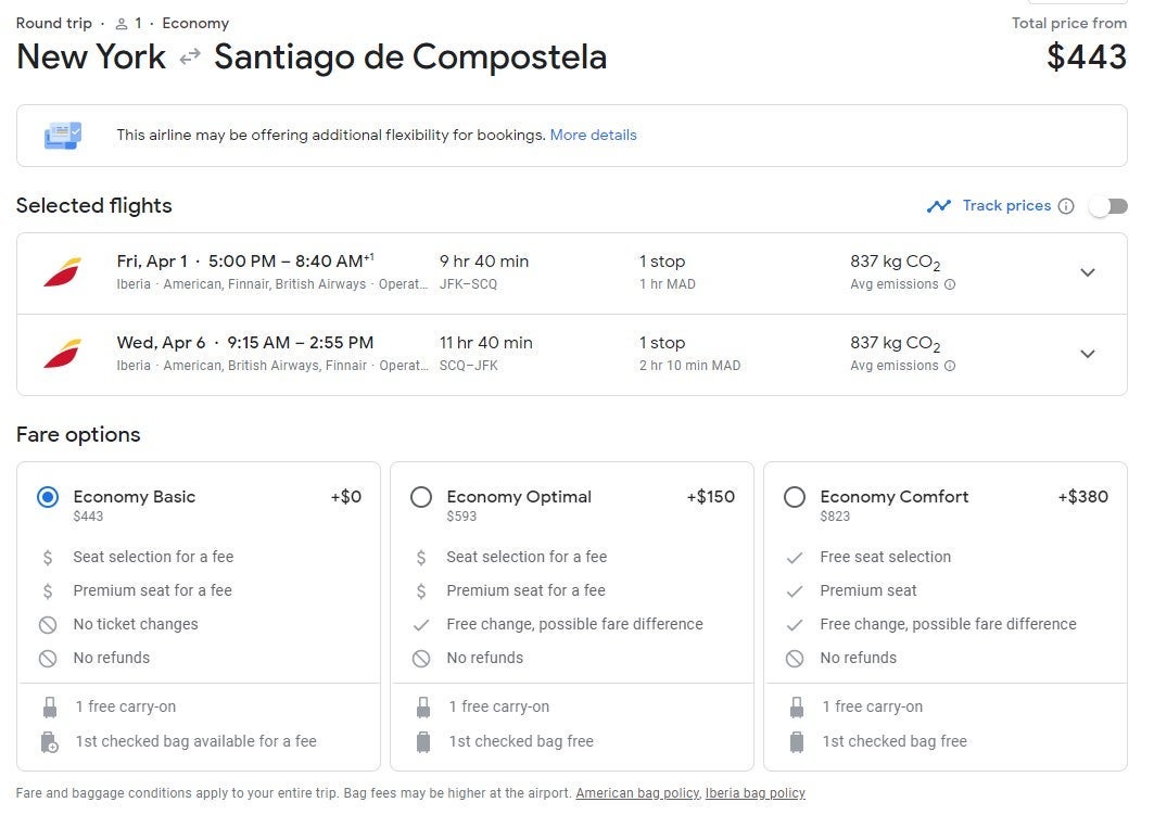 If you're flying from New York (JFK) to Santiago de Compostela, flights are limited in availability at the price of $443 round-trip. The deal we found was at the beginning of April.