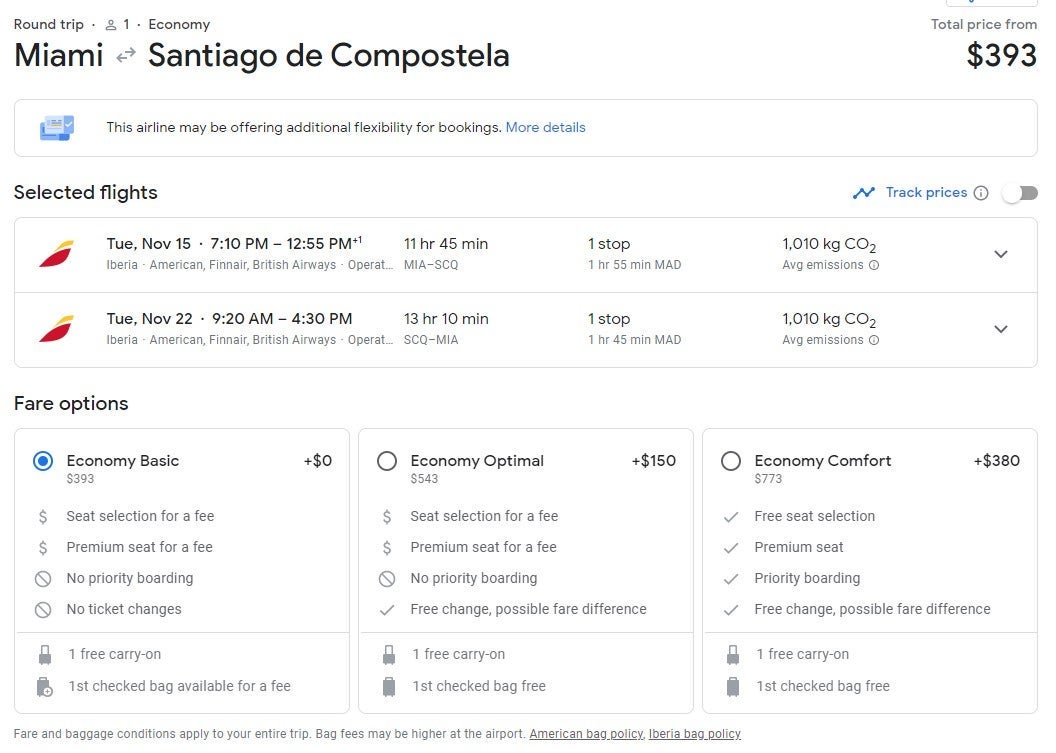 The deals below are for basic economy seating on Iberia, which includes a standard seat and carry-on. A checked bag, seat selection, changes and priority boarding will cost extra. Each flight below includes a stop in Madrid (MAD).
