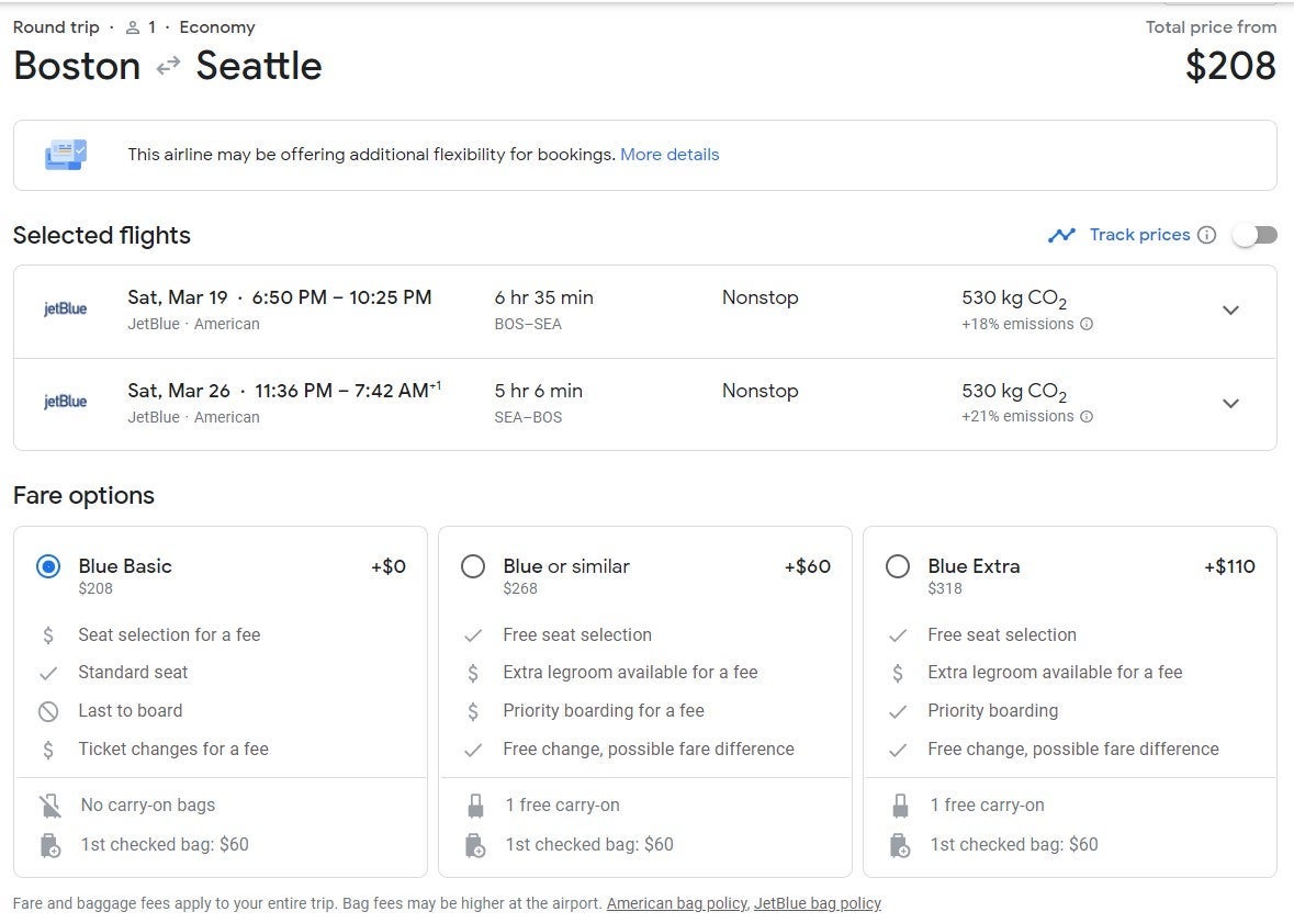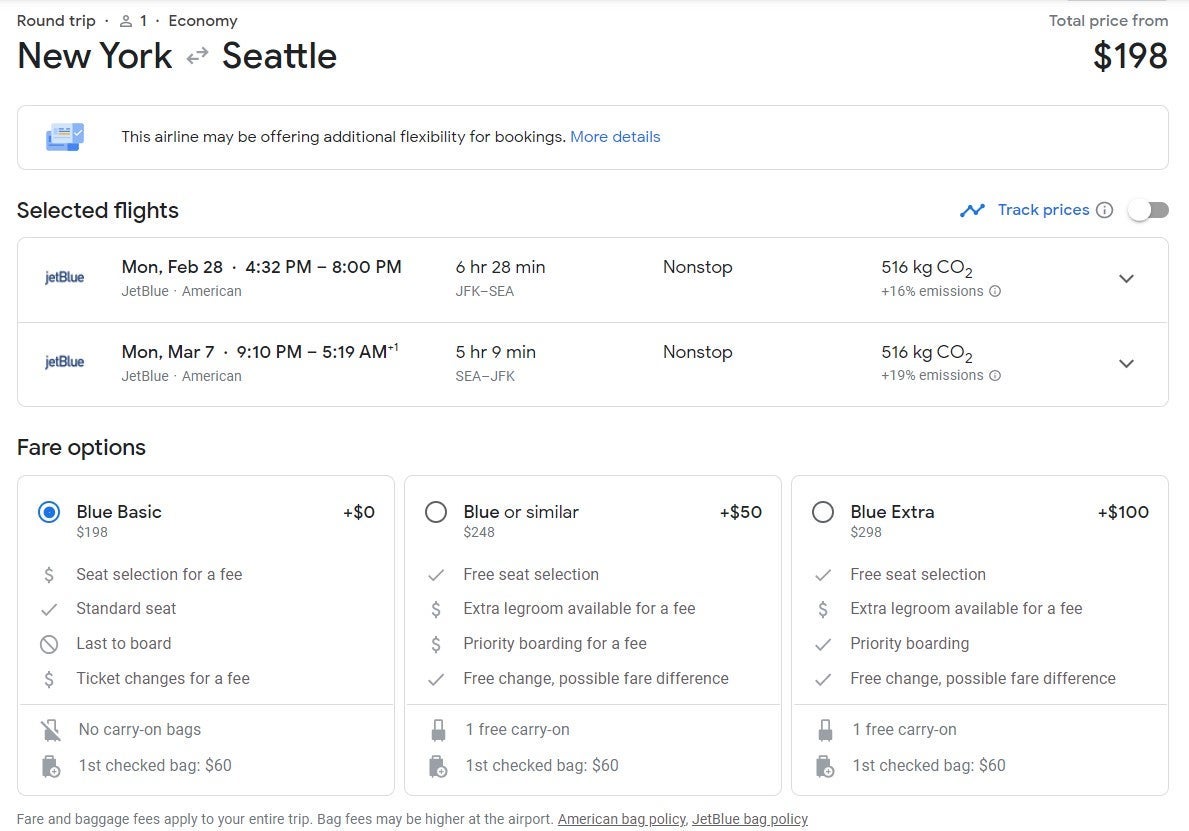 The deals below are for Blue Basic seats on JetBlue, which are the same as basic economy fares on other carriers and only include a standard seat. A carry-on, checked bag and seat selection cost extra.