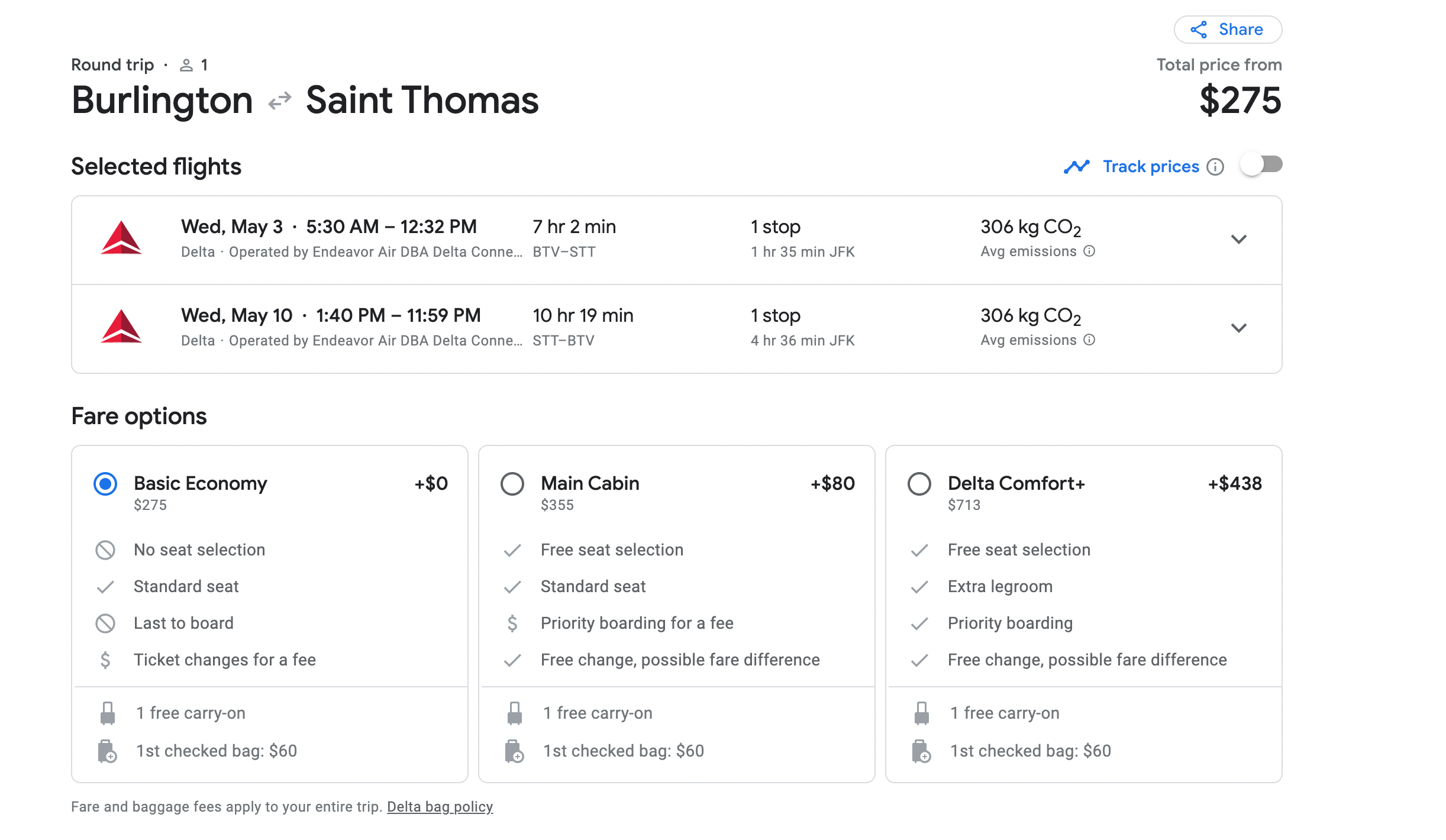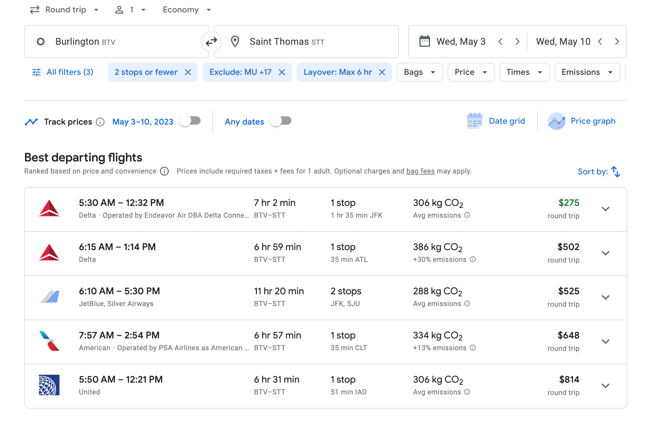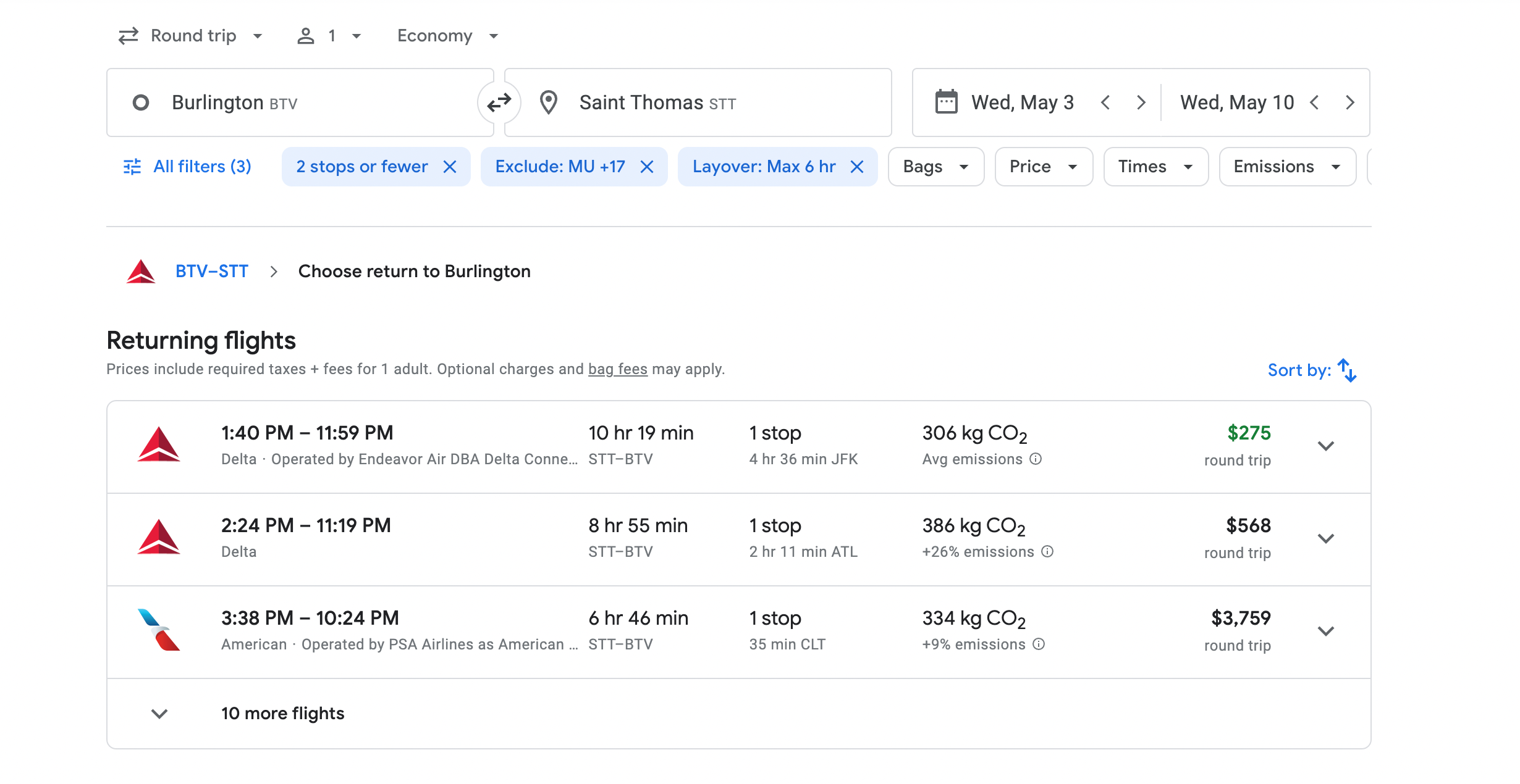 If you're booking a May 3 flight from Burlington, Vermont, to St. Thomas, a $275 Delta flight is the lowest option. American, Delta and United have other options, but each is at least $500.