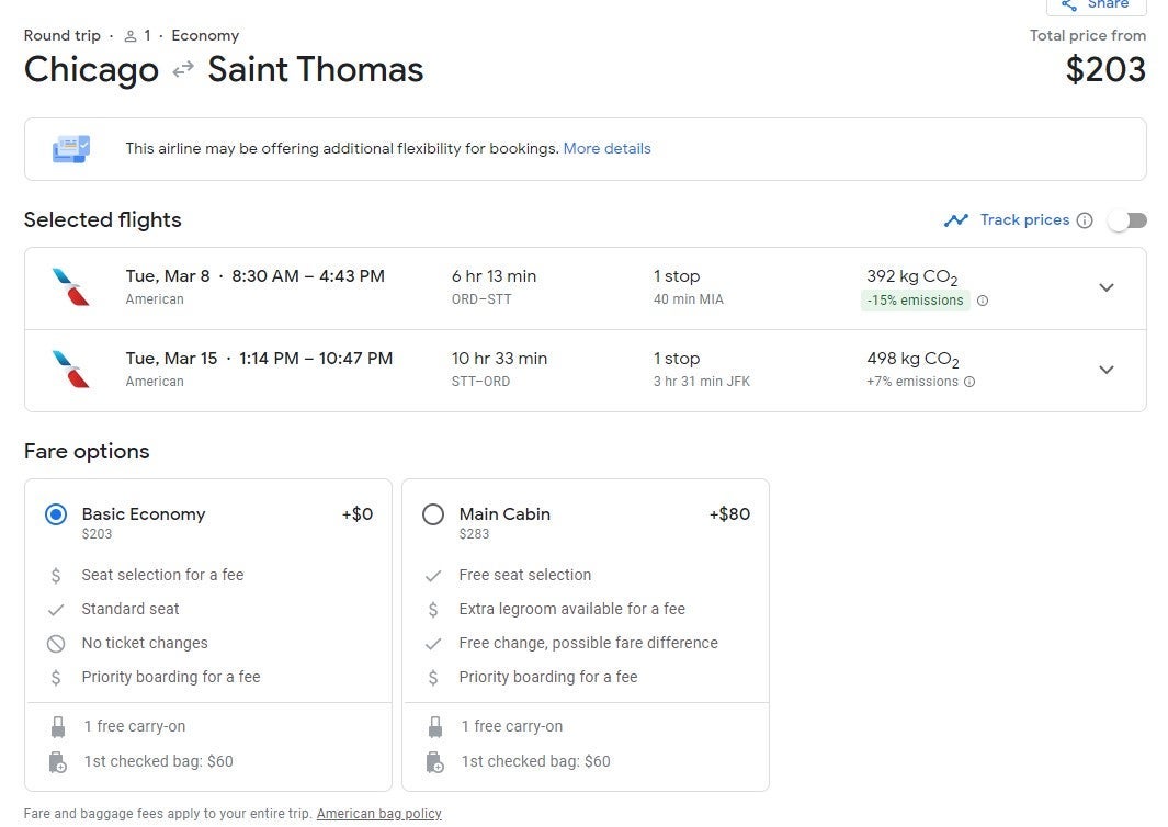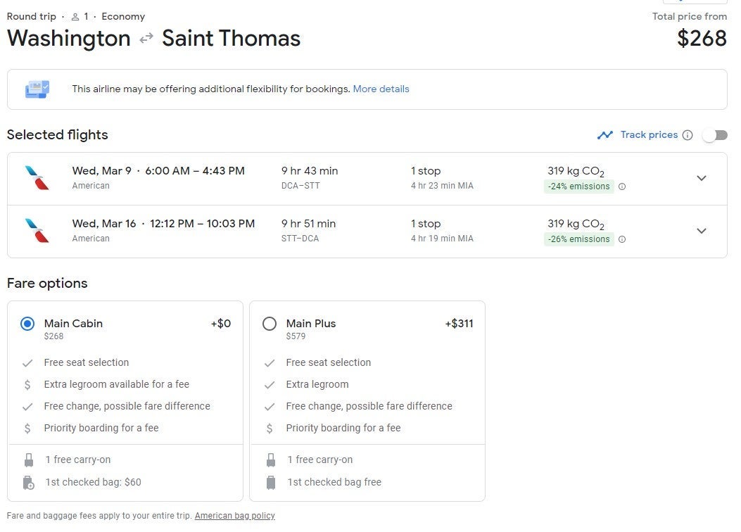 Travelers have a variety of Main Cabin flights from Austin, Texas (AUS), to St. Thomas throughout March for $266 round-trip. There is a stop in Miami each way.