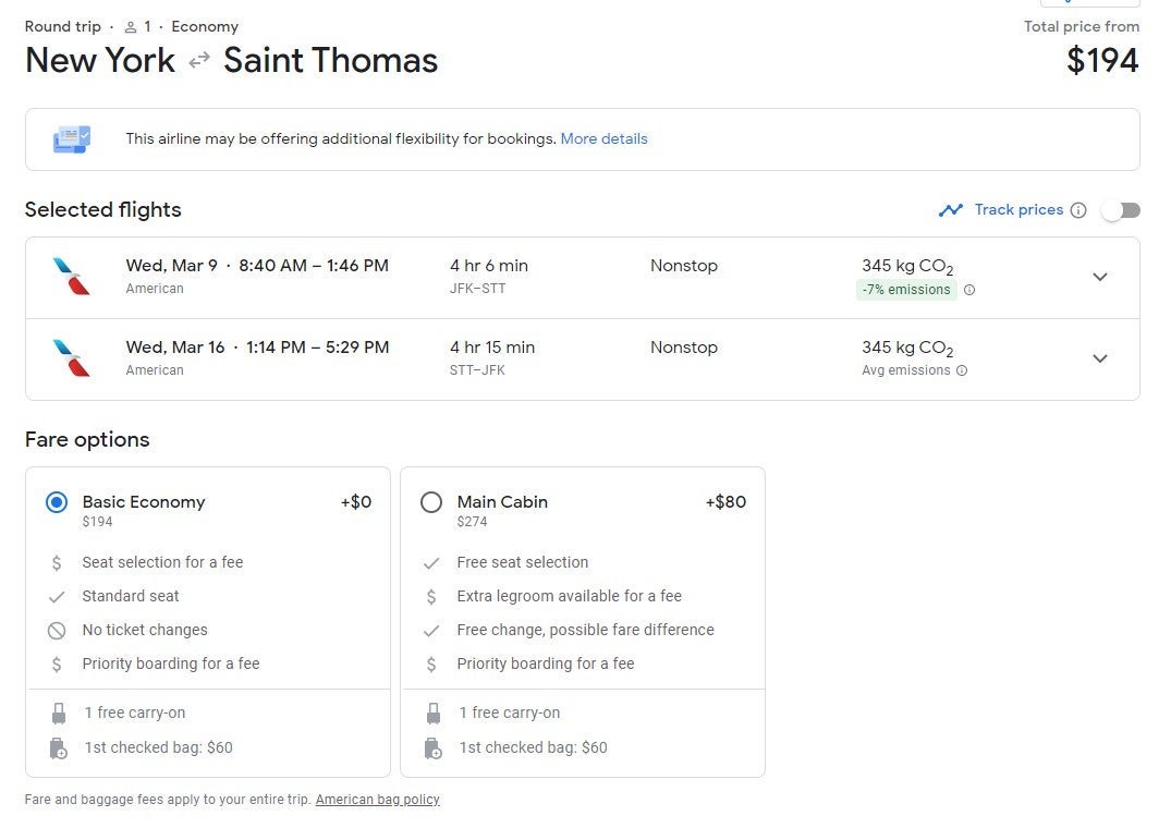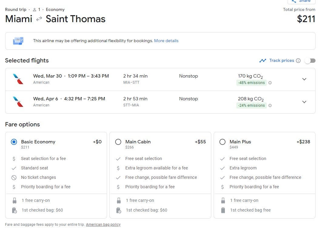 The following deals are for basic economy and Main Cabin fares on American Airlines. You are allowed a carry-on and standard seat with a basic economy ticket; a Main Cabin ticket also includes seat selection. A checked bag and priority boarding will cost extra.