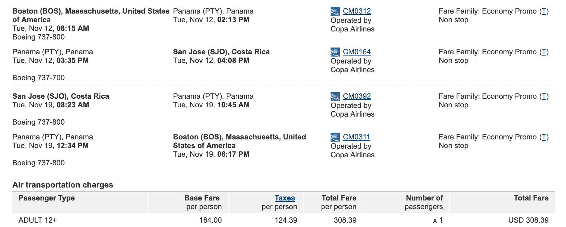 Boston (BOS) to San Jose (SJO) for $308 round-trip on Copa: