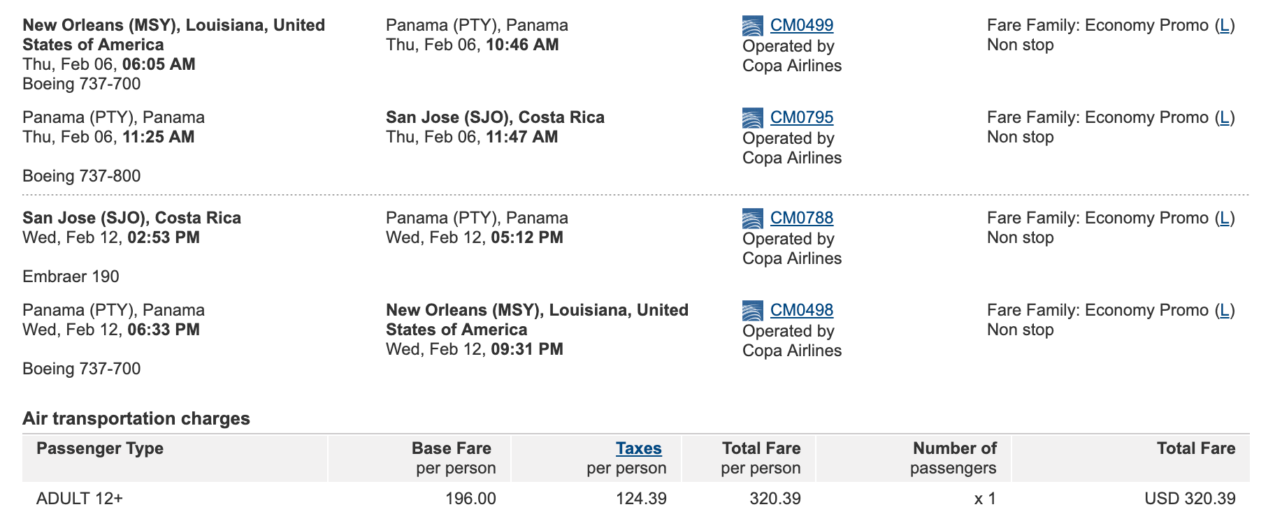 New Orleans (MSY) to San Jose (SJO) for $320 round-trip on Copa: