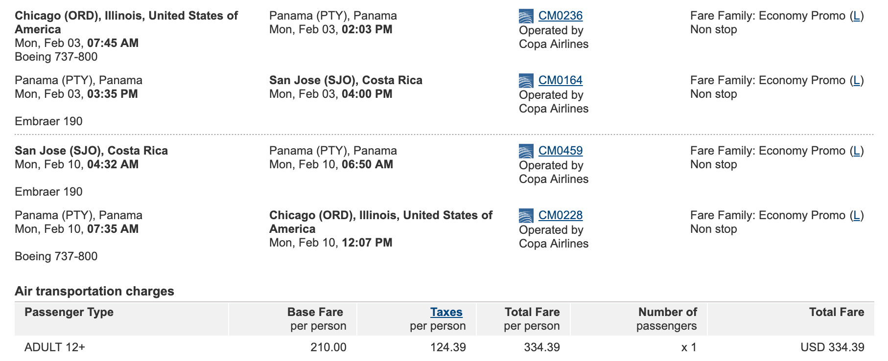 Chicago (ORD) to San Jose (SJO) for $334 round-trip on Copa: