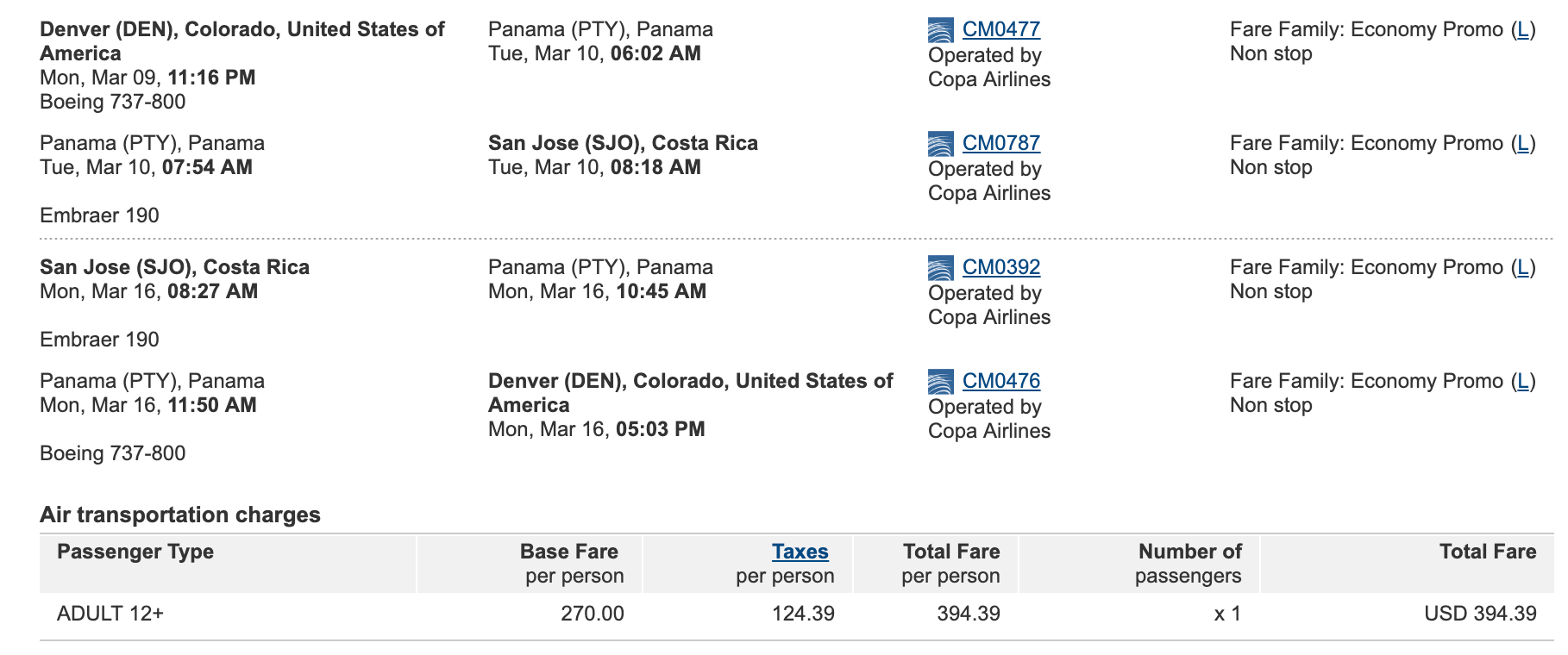 Denver (DEN) to San Jose (SJO) for $394 round-trip on Copa: