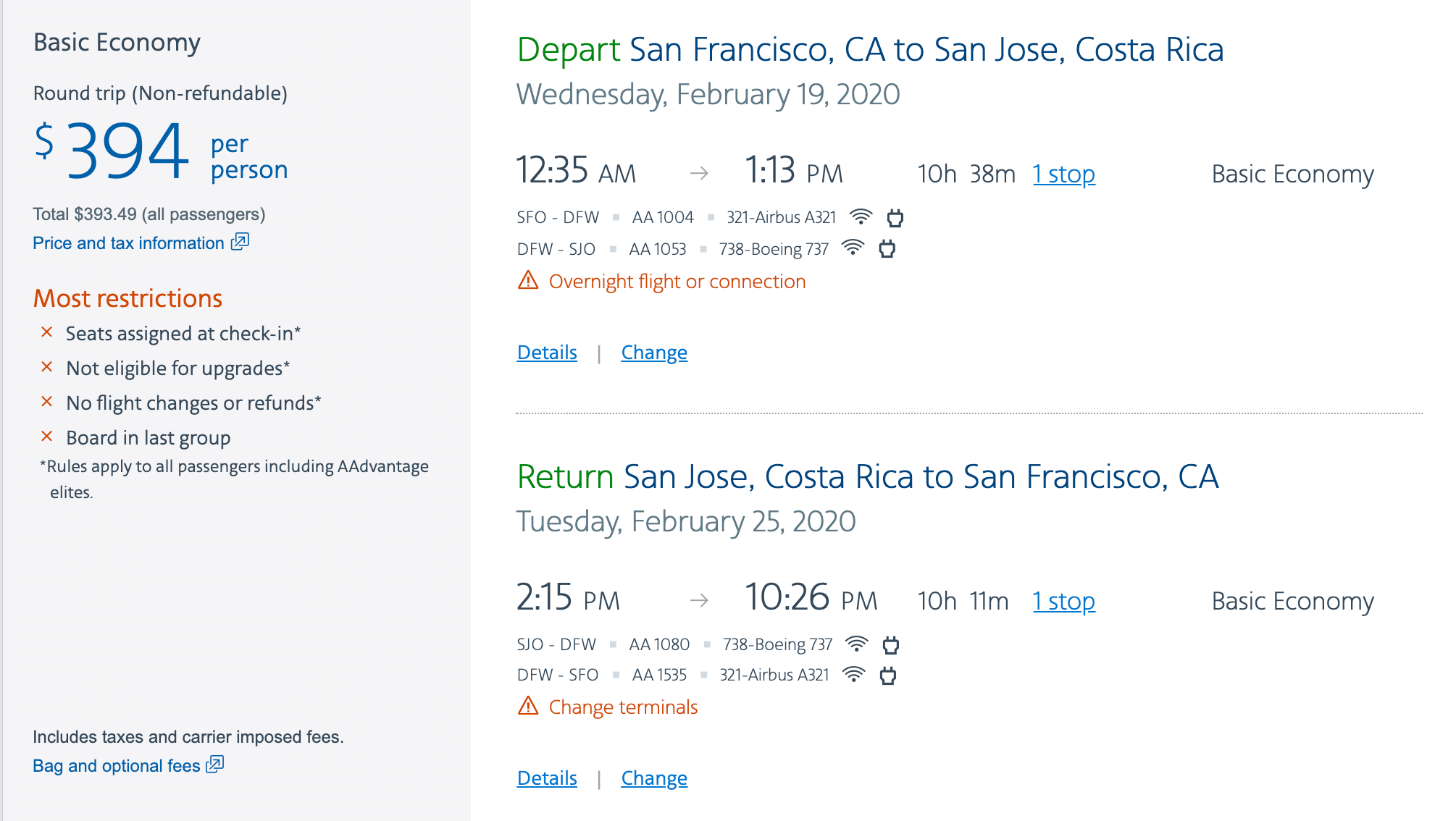 San Francisco (SFO) to San Jose (SJO) for $394 round-trip on American:
