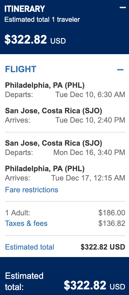 Philadelphia (PHL) to San Jose (SJO) for $323 round-trip on JetBlue: