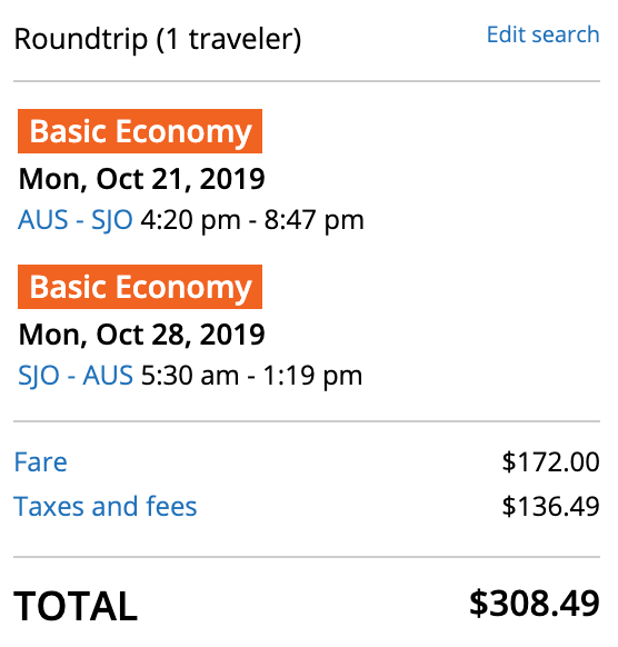 Austin (AUS) to San Jose (SJO) for $308 round-trip on United: