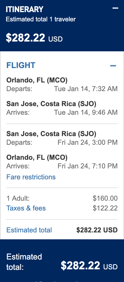 Orlando (MCO) to San Jose (SJO) for $282 round-trip on JetBlue: