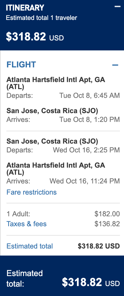 Atlanta (ATL) to San Jose (SJO) for $319 round-trip on JetBlue: