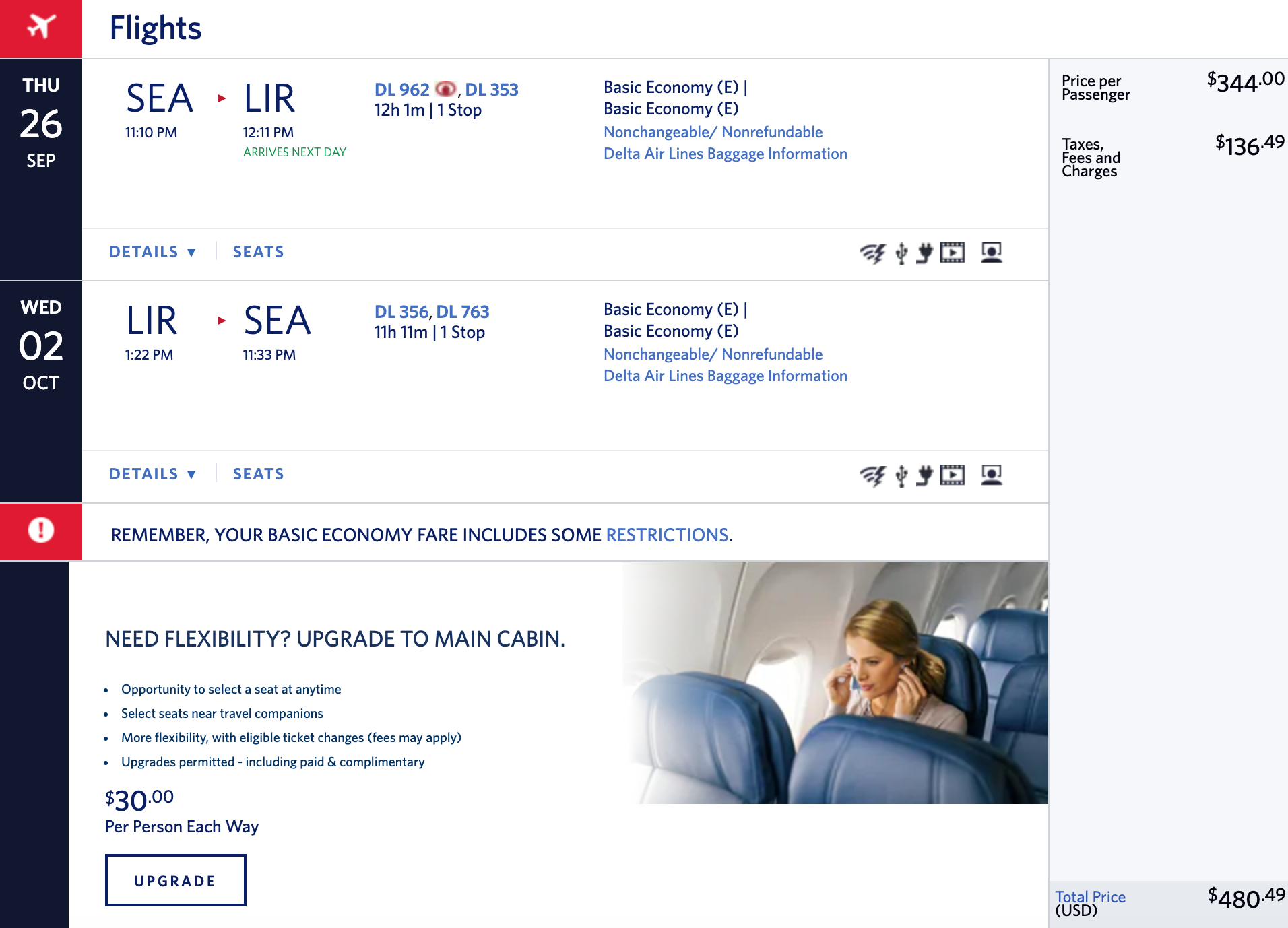 Seattle (SEA) to Liberia (LIR) for $480 round-trip on Delta: