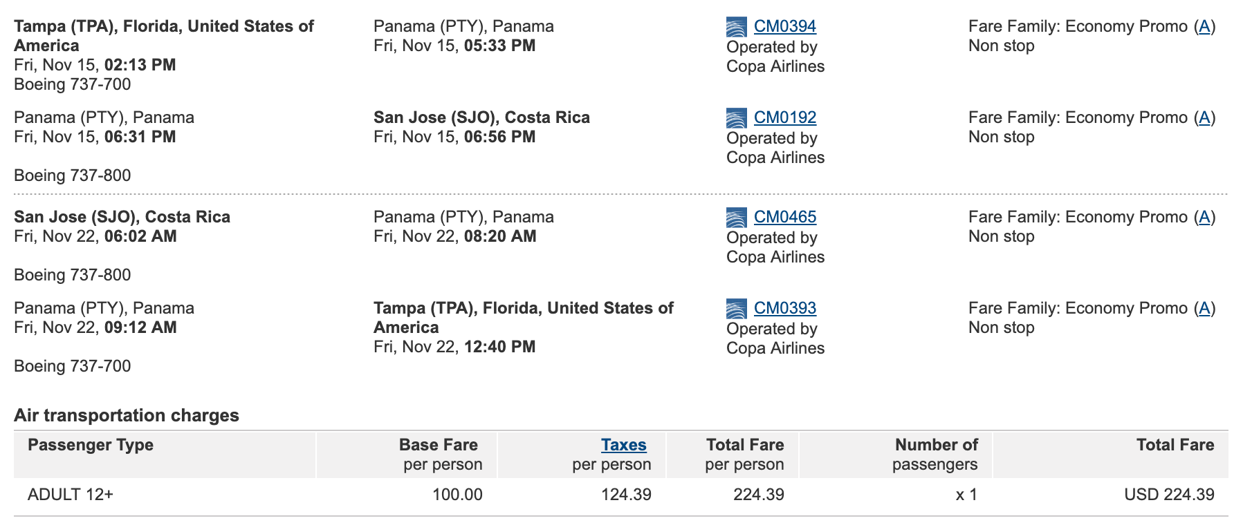 Tampa (TPA) to San Jose (SJO) for $224 round-trip on Copa: