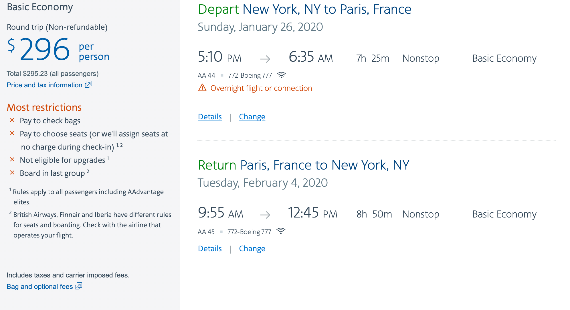 New York (JFK) to Paris (CDG) for $296 round-trip on American: